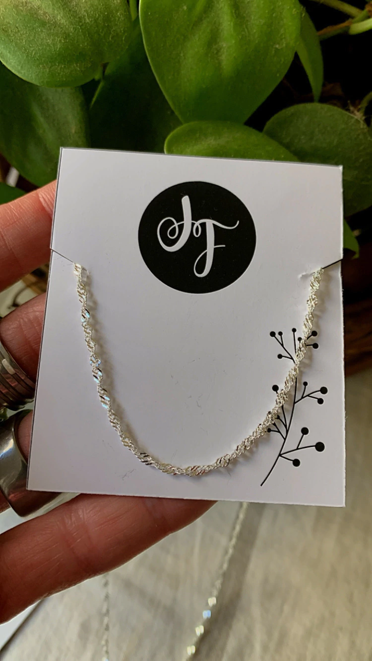 Delicada y con estilo 💫. Esta cadena Tourbillon en acero blanco tiene un diseño entrelazado que le aporta movimiento y brillo sutil. Perfecta para usar sola o combinar con dijes y armar un look moderno y canchero.
